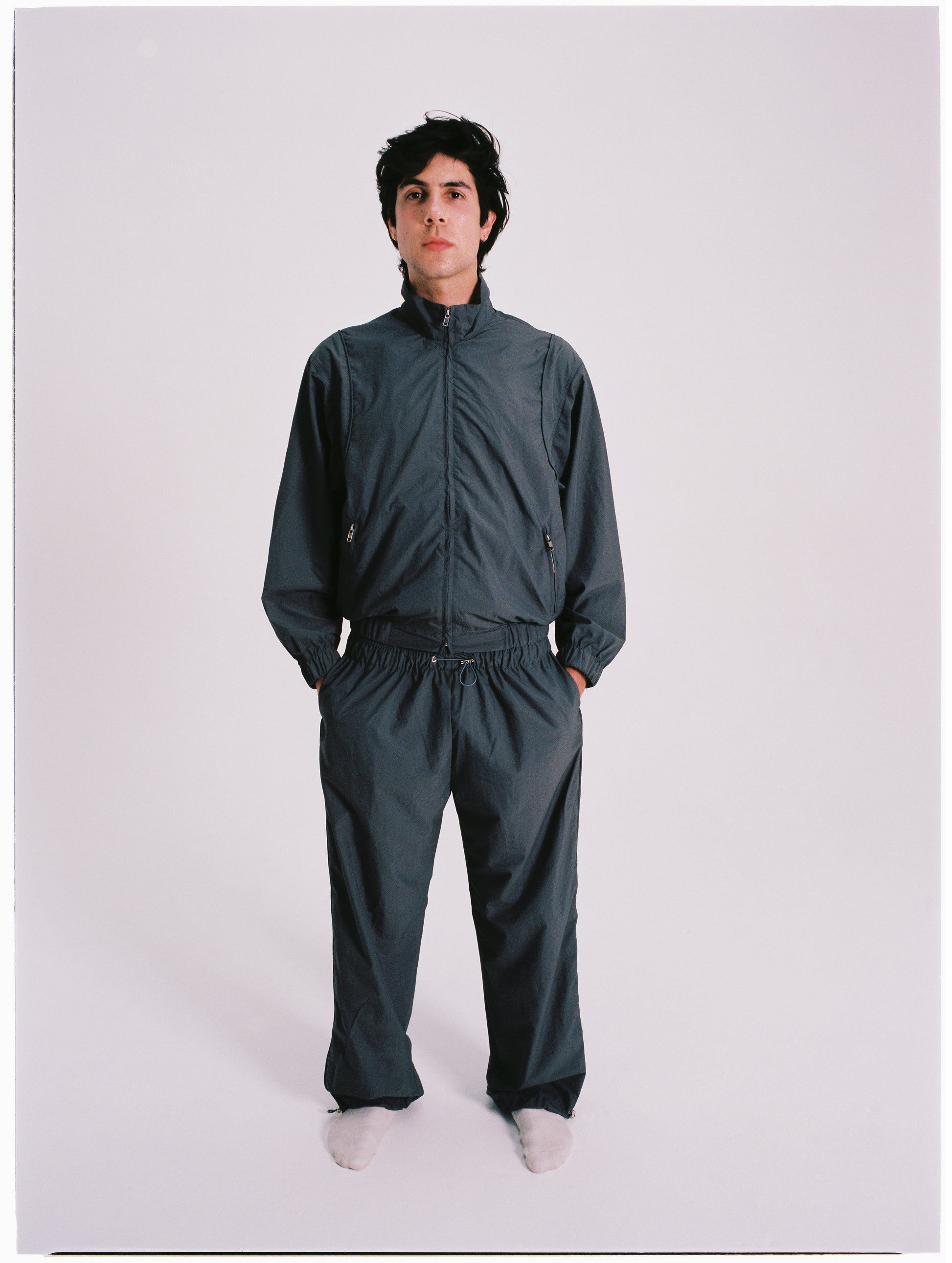 A straight leg pant made with recycled nylon fabric. Featuring piping along the side seams, bungees at waist and ankles to customize fit.