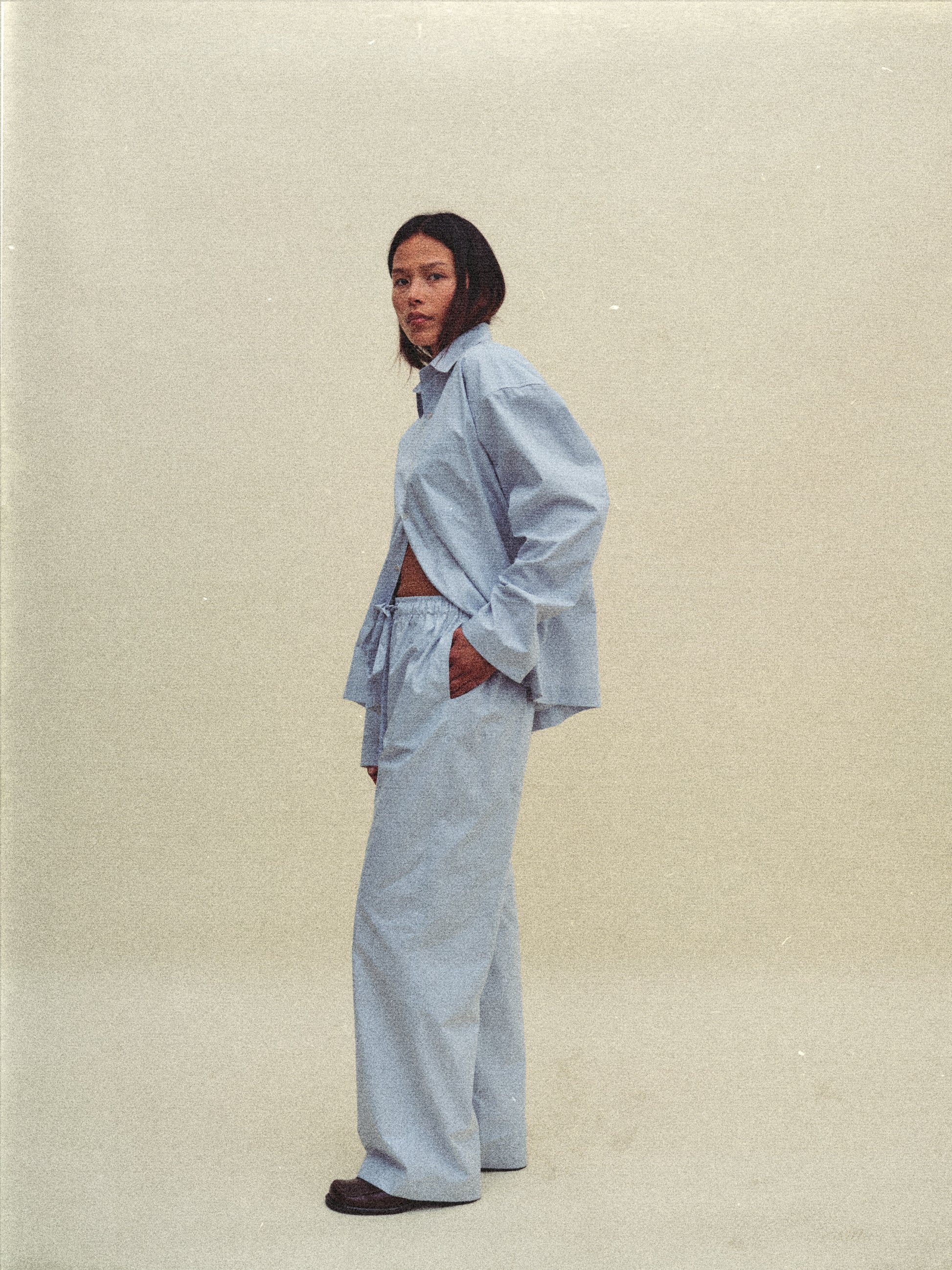 Cut from typewriter poplin fabric containing a strong structure and a smooth surface, while being lightweight and breathable.