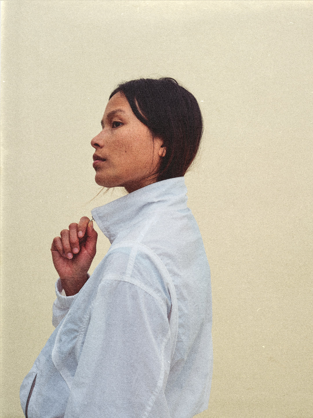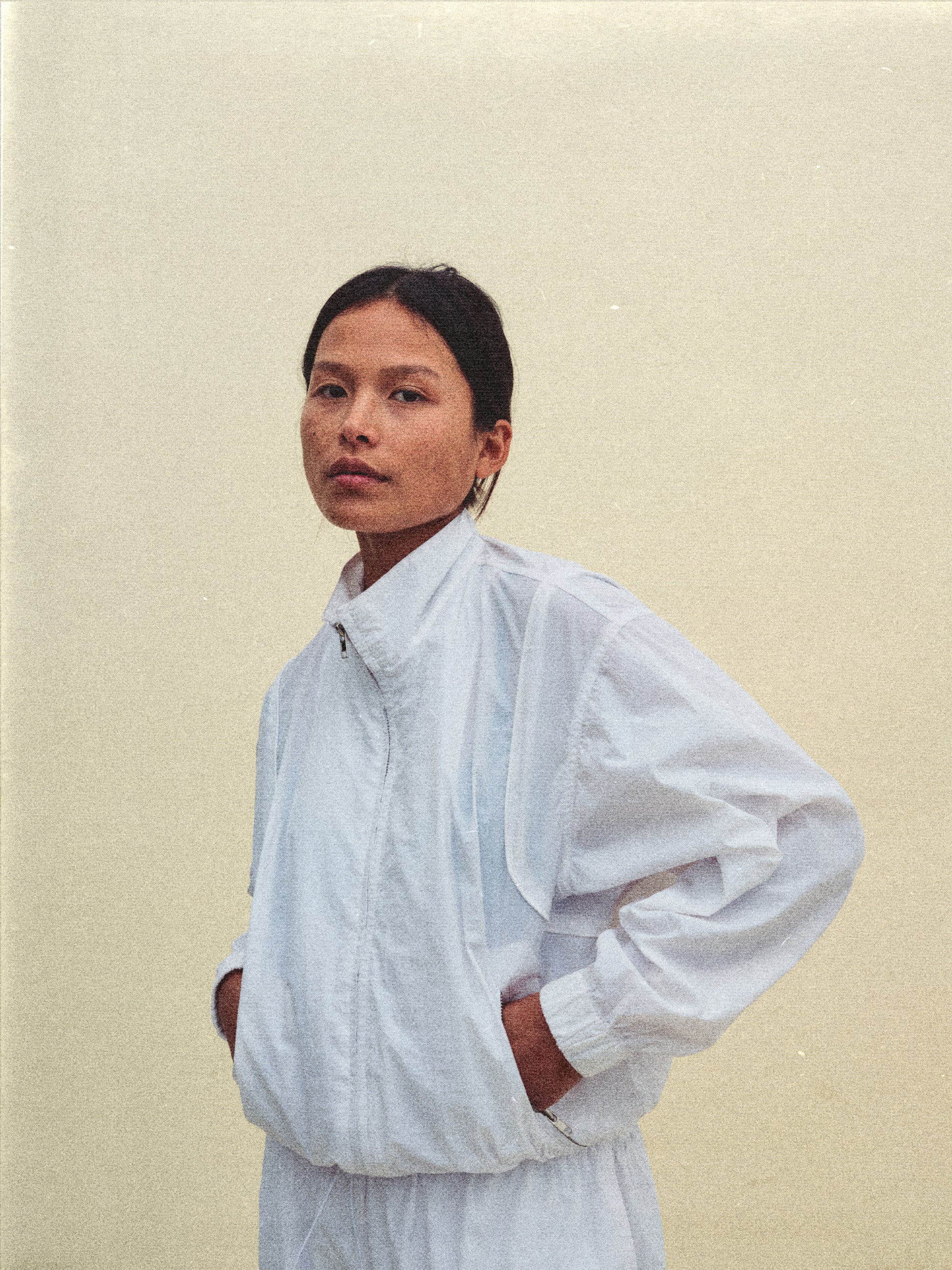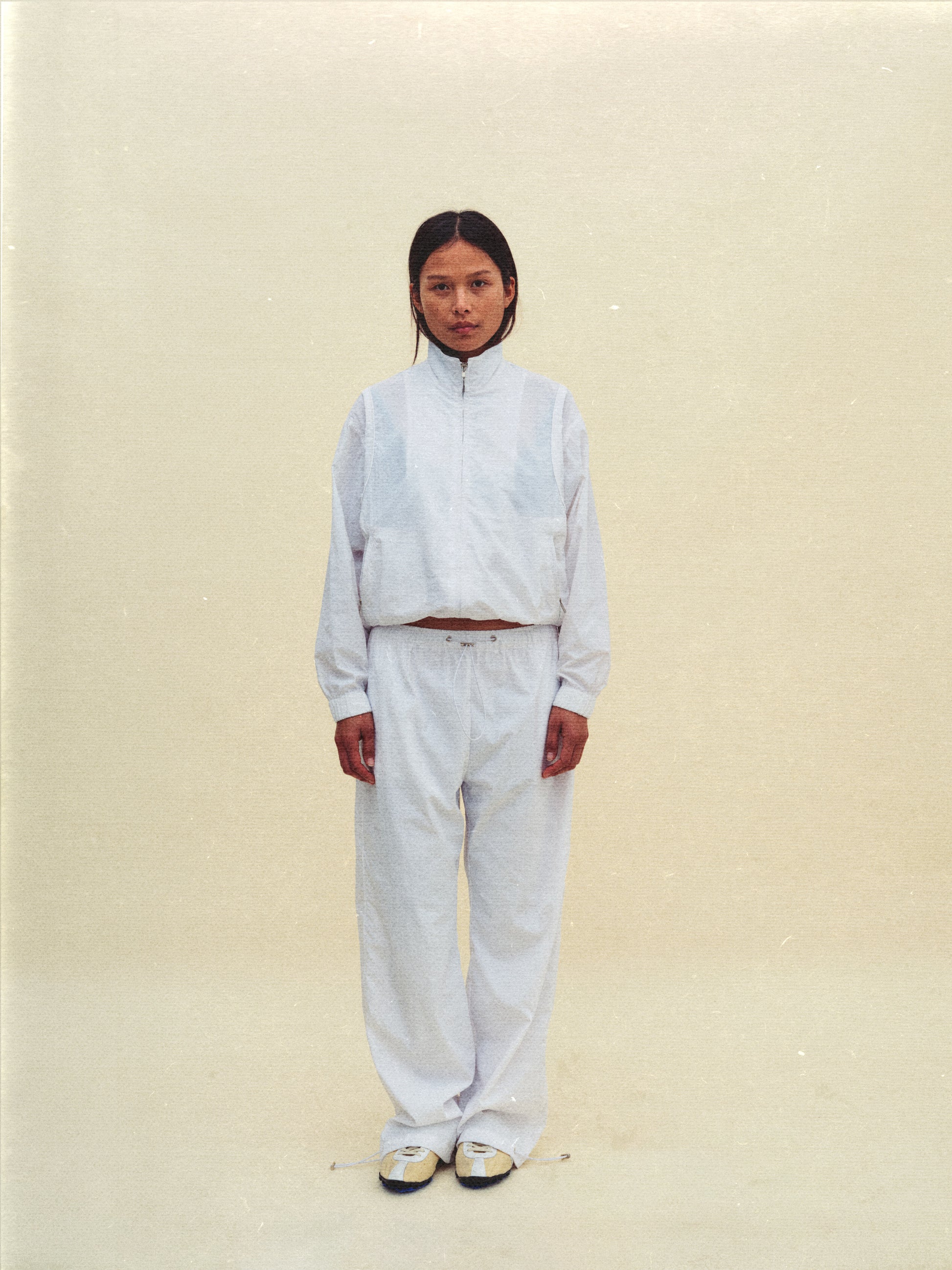 A loose fit track jacket cut from a lightweight recycled nylon fabric. It features a full front zipper closure and elastic waist and cuffs.